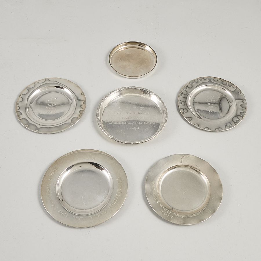 silver, 6 st, samtliga graverade, Diameter: 7,5-11 cm. Vikt: 190 g ca