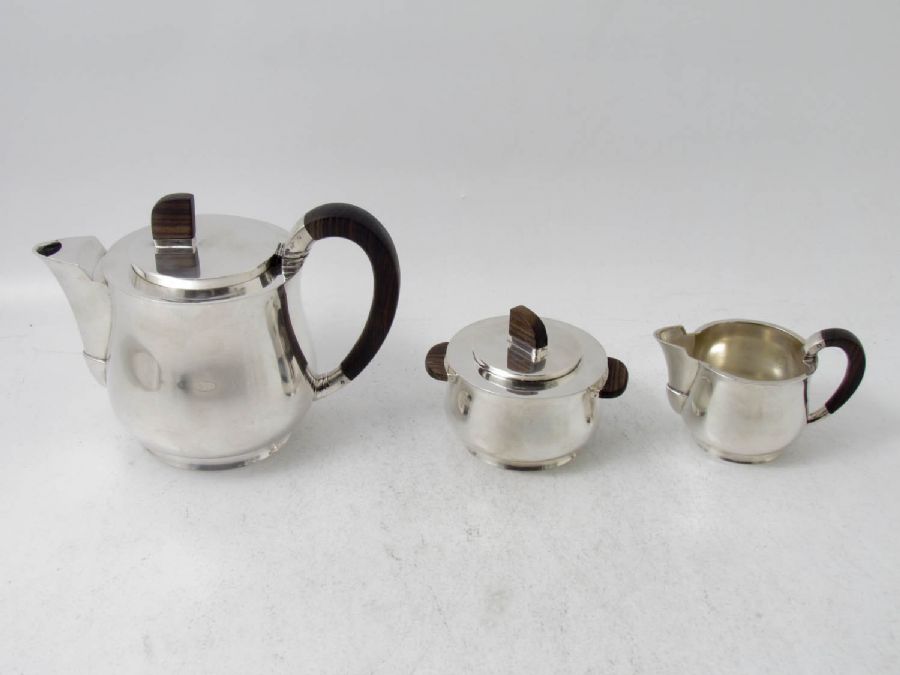 silver, 3 delar, handtag av trä, tyska stämplar, M Sunde, vikt: 1270 gr, höjd på kannan: 18 cm