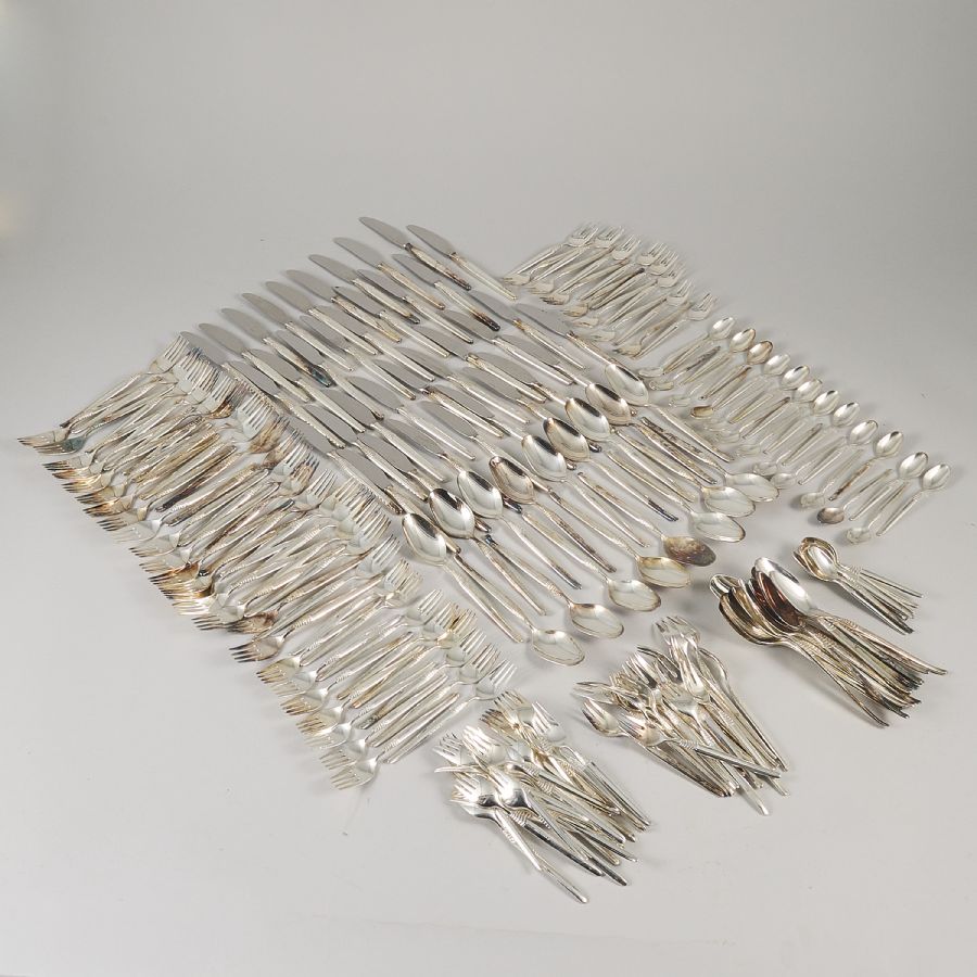 214 delar, Nysilver, Modell: Cheri, GAB Guldsmedsaktiebolaget, Design: Henning Seidelin, 5x36 + 1x34 (kaffeskedar)