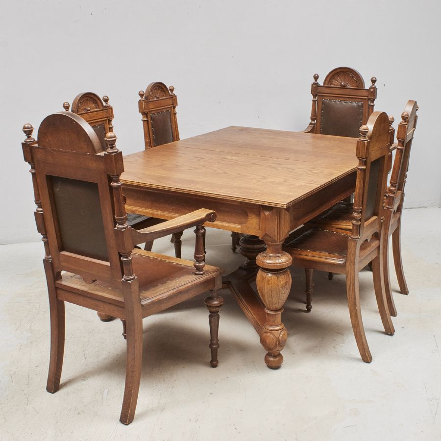 13 delar, Ek, Nyrenässans, Bord + 10 stolar+ 2 karmstolar. Längd: 147 cm, djup: 114 cm, höjd: 78 + 3 iläggx35 cm