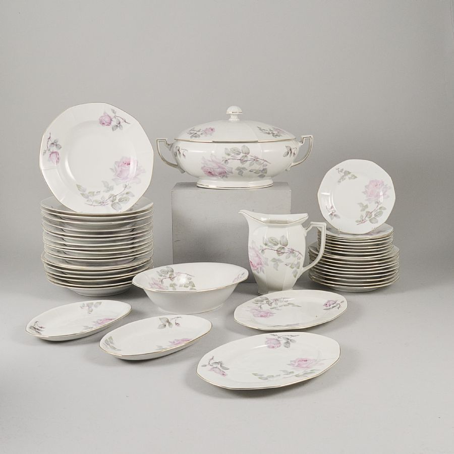 42 delar, porslin, motiv av rosor med guldkant, 15 mattallrikar, 4 djupa tallrikar, 9 förrättstallrikar, 9 assietter, 5 uppläggningsfat/skål, kanna, soppterrin.