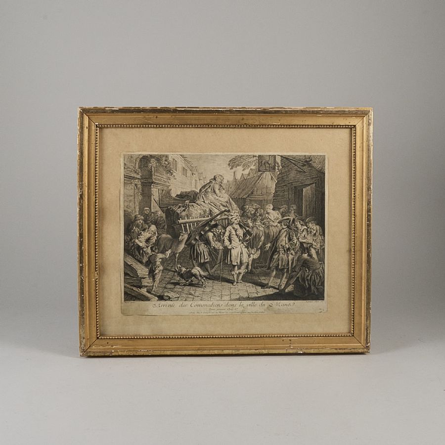 Oidentifierad konstnär. "Arrive des commediens dans la ville du Mana". Bildmått: 30x38 cm, yttermått inklusive ram: 45x53 cm. Ej signerad
