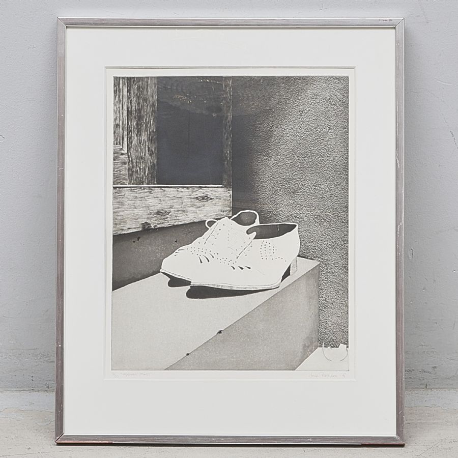 Lensa Pettersson, "Vagabondens uppbrott". Signerad, numrerad 32/50, daterad -78. Bildmått: 49x39 cm, yttermått inklusive ram: 71x58 cm