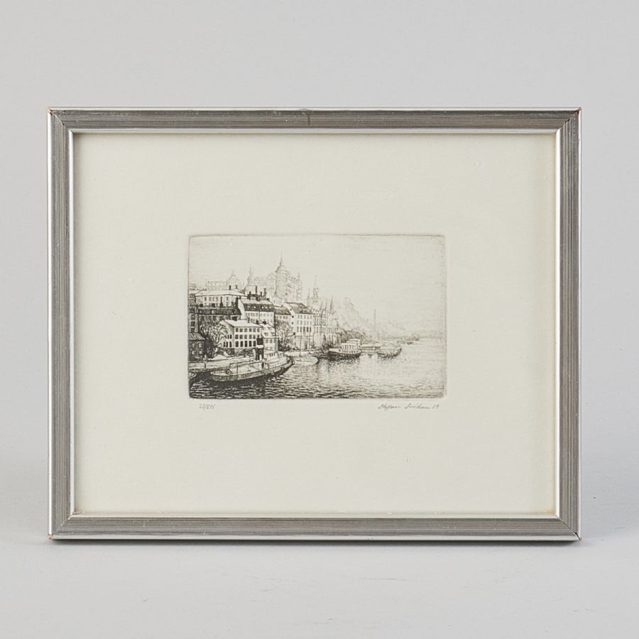 Etsning, "Södermälarstrand" signerad, numrerad 23/275, daterad 1989. Motivet: 6,5x10,5 cm, yttermått inklusive ram: 17x21 cm