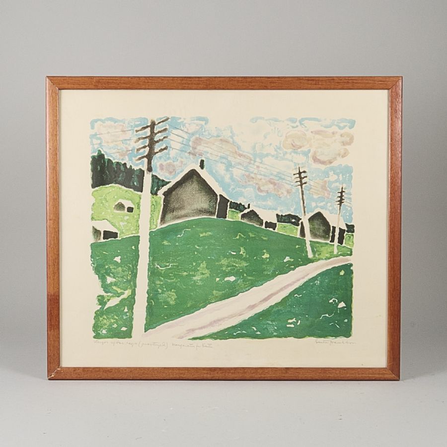 "Stugor efter regn". Signerad, daterad pt. Färglitografi, bildmått: 40x46 cm, yttermått inklusive ram: 53x63 cm