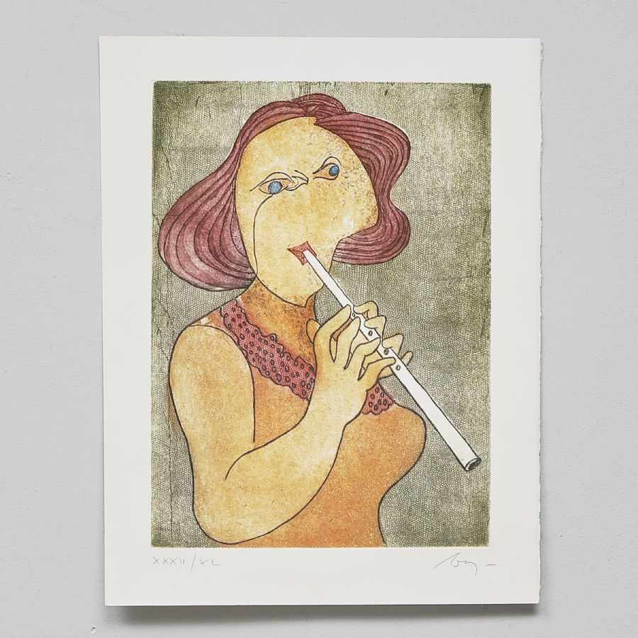 Signerad, numrerad 32/40, kvinna med flöjt. Färglitografi. Bladets mått: 65x50, oramat löst blad
