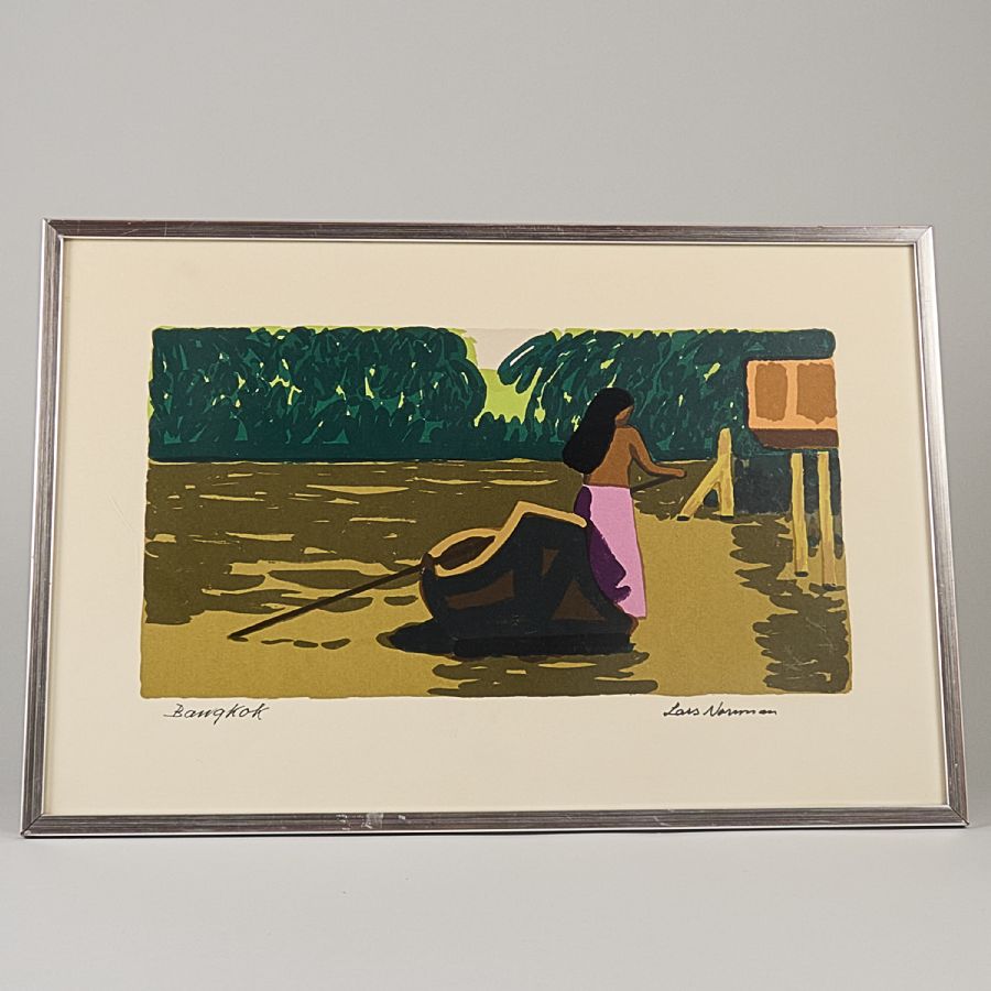 Signerad, "Bangkok". Färglitografi, bildmått: 24x45 cm, yttermått inklusive ram: 40x59 cm