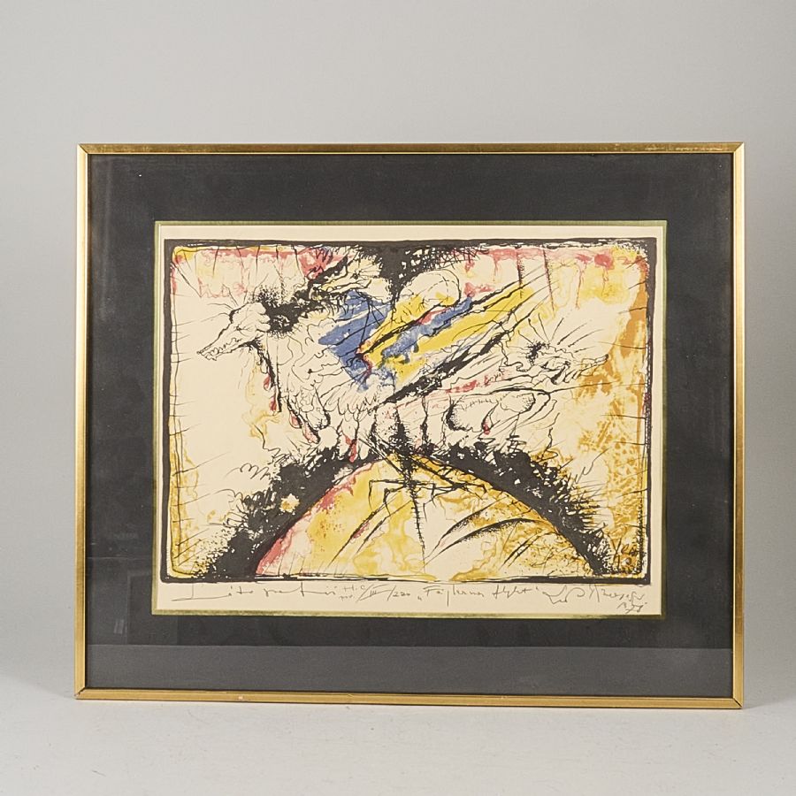 LITOGRAPH IN COLORS, HC . Signerad, numrerad 3/220, - 78, "Fåglarnas flykt". Färglitografi, bildmått: 40x50 cm, yttermått inklusive ram: 57x67 cm.