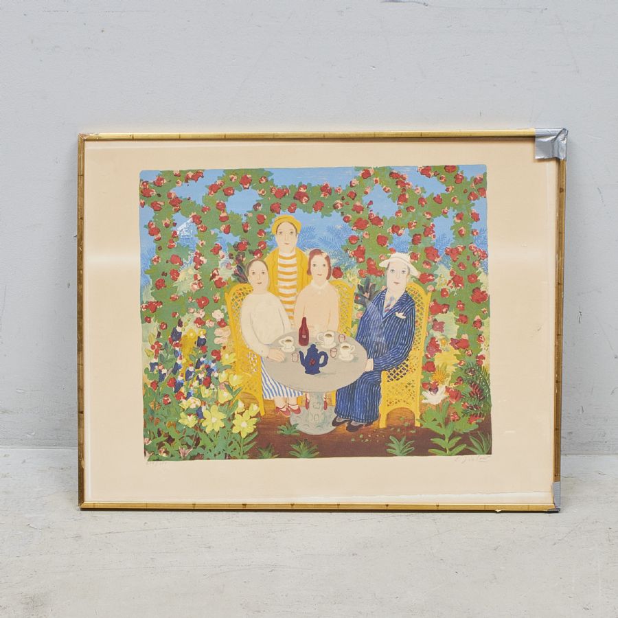 Signerad, numrerad 278/380, i trädgården. Färglitografi. Bladets mått: 55x73 cm, yttermått inklusive ram: 60x76 cm