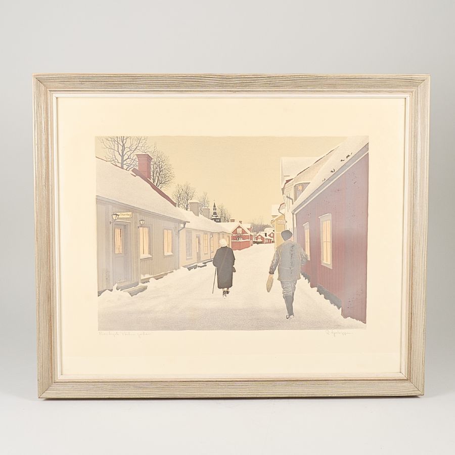 Vintermotiv från Trosa, "Västra gatan". Signerad, numrerad pt. Färglitografi, bildmått: 34x47 cm, yttermått inklusive ram: 57x69 cm