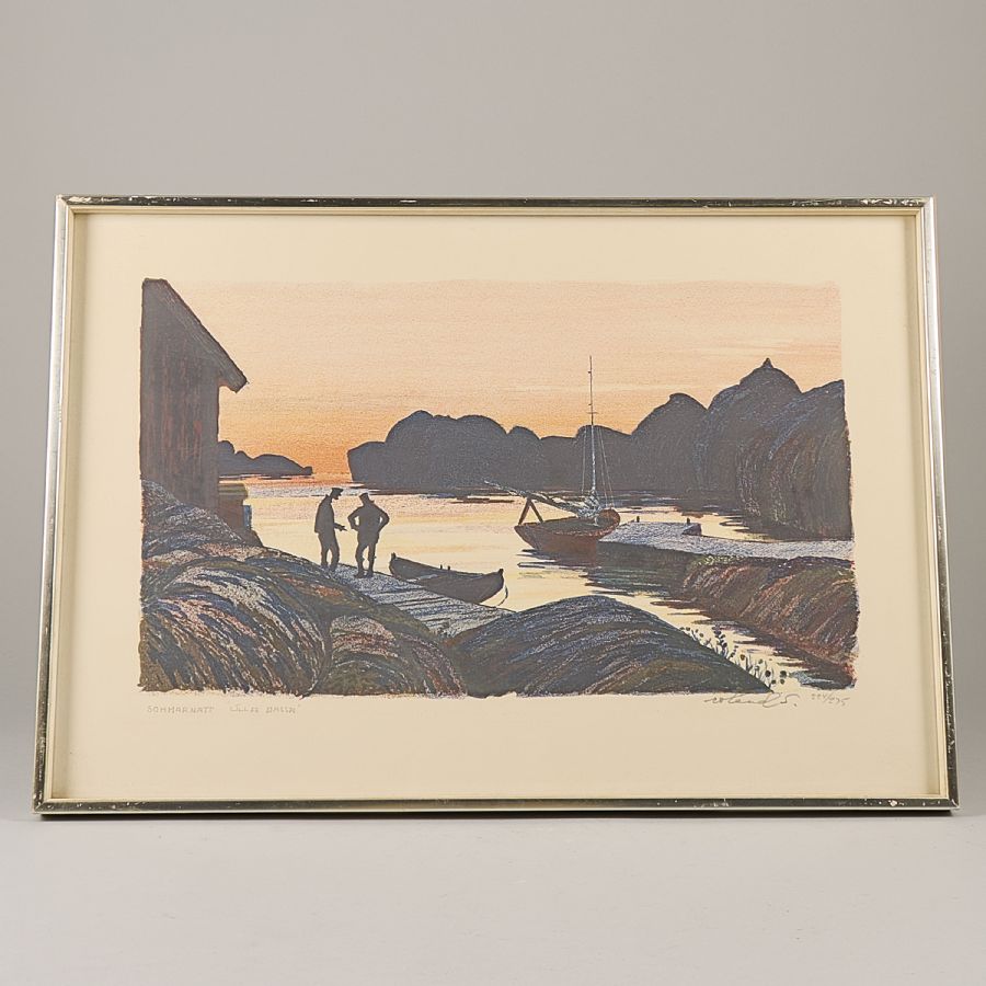 "Sommarnatt Lilla Nassa". Signerad, numrerad 224/275. Färglitografi, bildmått: 28x45 cm, yttermått inklusive ram: 42x61 cm