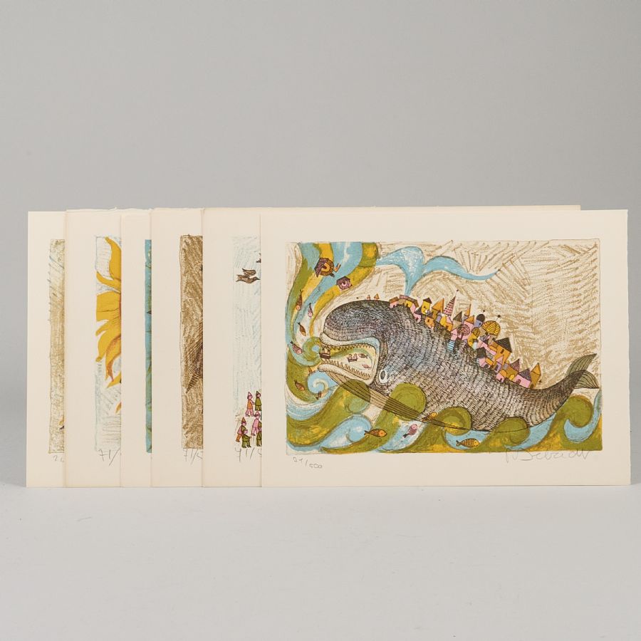 Färglitografier, 6 st, Oramade lösa blad. Signerad, numrerad 71/500. Färglitografi. Bladets mått: 22,5x30 cm