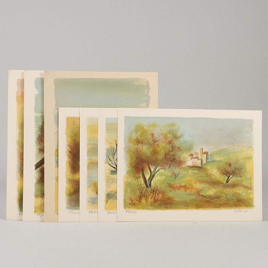 7 pcs, Gerard Zarou Cardella (1930-2013), oramade lösa blad, landscape with houses. Signed, numbered 39/500. Litograph in colors. Sheet: 27, 5x21,
