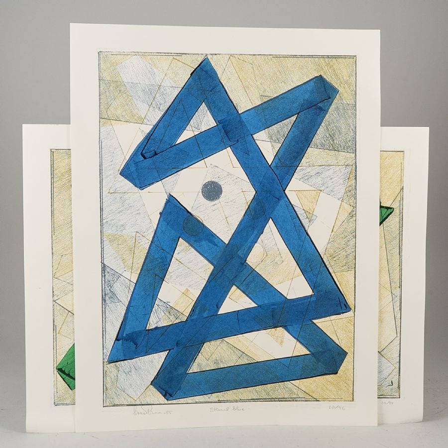 2 st, Oidentifierad konstnär. "Eternal Blue & Green". Signerad, daterad -85, oramade lösa blad. Färglitografi. Bladets mått: 62x47 - 47x62 cm