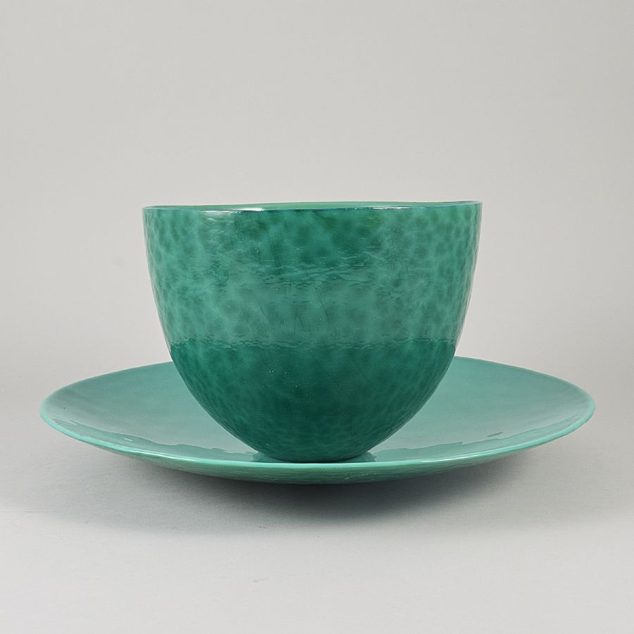 Fat, + skål, Pukeberg, glas, "Malakit". Diameter: 27- 45 cm, höjd: 5. 5 - 21 cm