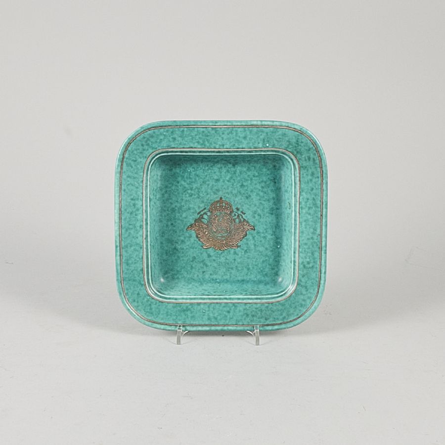 Fat, Argenta, Gustavsberg. Stengods, grön glasyr med målad silverdekor, med dedikation till Stockholm stad Brandförsäkringskontor, 21x21 cm