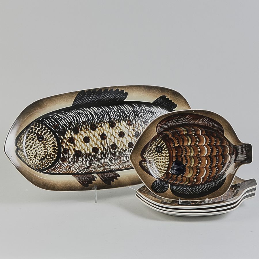 Fiskservis, Porslin, 1 st uppläggningsfat och 4 tallrikar, Arabia, ateljé GOG/PM. Längd: 33-61 cm