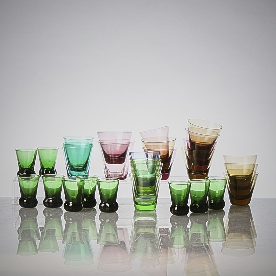 30 st, flerfärgat glas, 20 selterglas, 10 snapsglas. Höjd: 6-8 cm