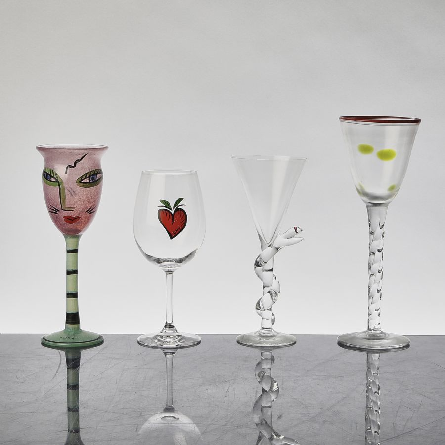 Glas, 4 st, Kosta Boda, delvs Atelje, bland annat "Open Minds" och "Cleopatra". Höjd: 21,5-28,5