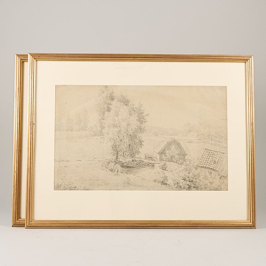 Blyerts, 2 st, "Åby". Signerad, daterad 1867. Bildmått: 29x48 cm, yttermått inklusive ram: 48x64 cm