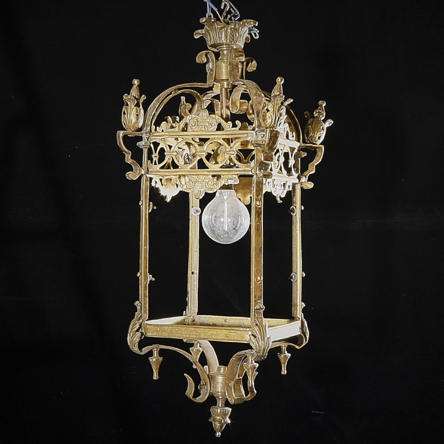 19th century, brass. Height: 70 cm, diameter: 37 cm, missing glass, a damage.