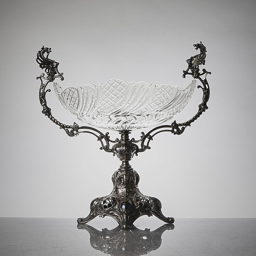 nysilver, med glasinsats. Längd: 37 cm. Höjd: 37 cm