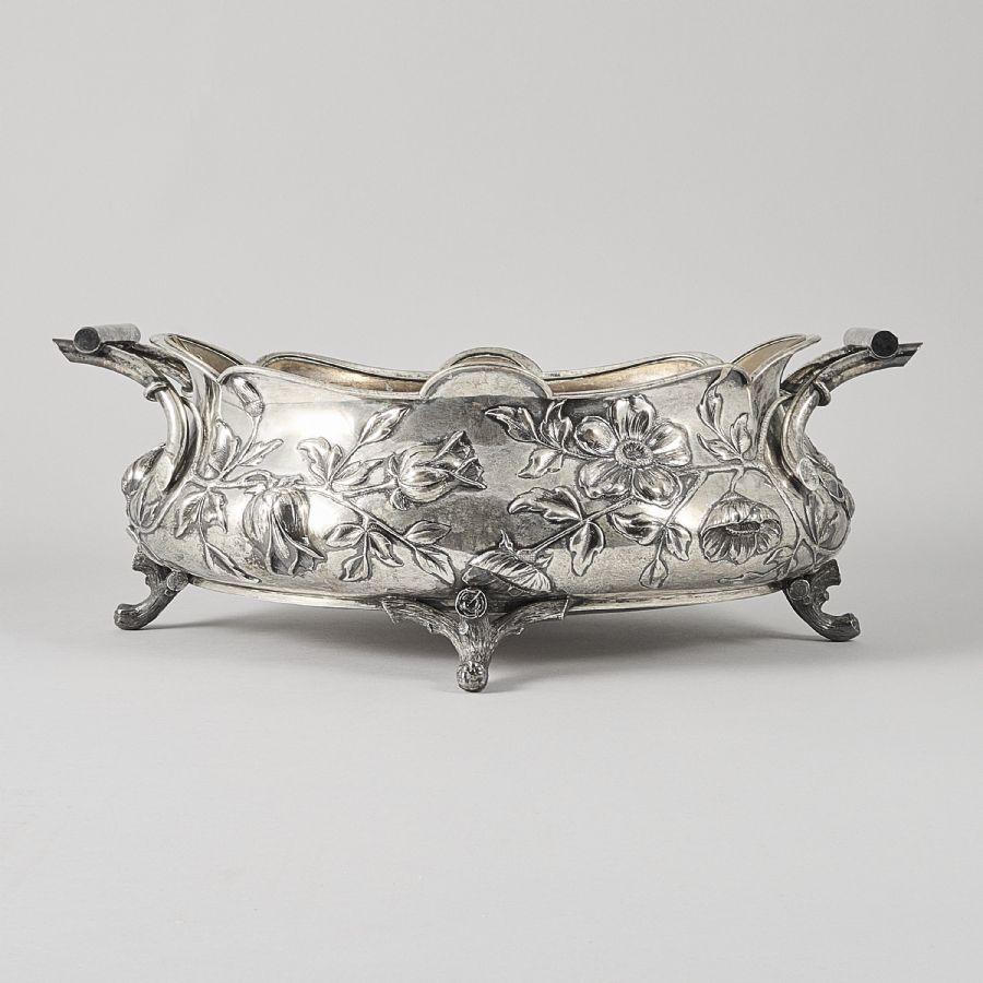silver, CG Hallberg, 1899, Mässingsinsats, dekor med blomster. Längd: 49 cm, höjd: 18 cm, vikt: 2460g silver, vikt: 3780 brutto