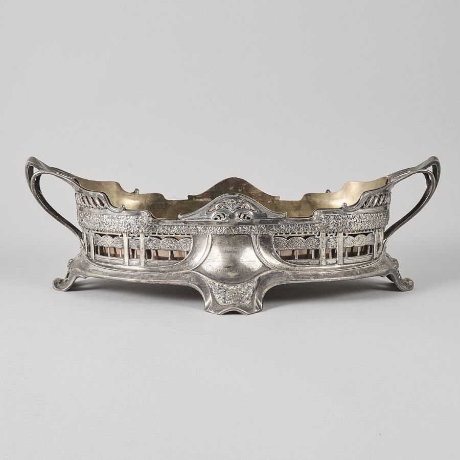 silver, CG Hallberg, mässingsinsats. 1906, med gravyr. Längd: 58 cm. Höjd: 19 cm, Vikt: 1610 silver. Vikt: 2600 brutto