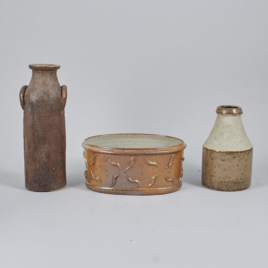 + 2 vaser, stengods. Höjd: 13-34 cm