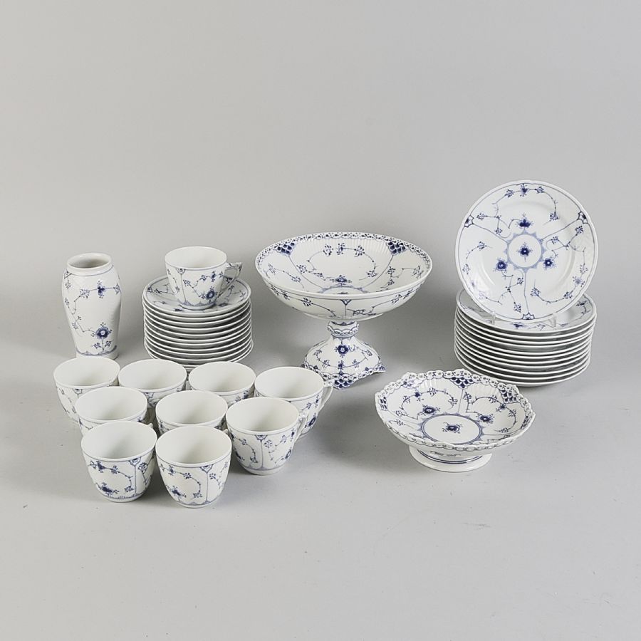 25 delar Mulsselmalet, Royal Copenhagen & B&G, 10 kaffekoppar + assistter samt vas Bign & Gröndahl, 2 st kakfat Royal Copenhagen varav en helblond, 8 - 21,5 cm. Höjd: 6. 5 15 cm