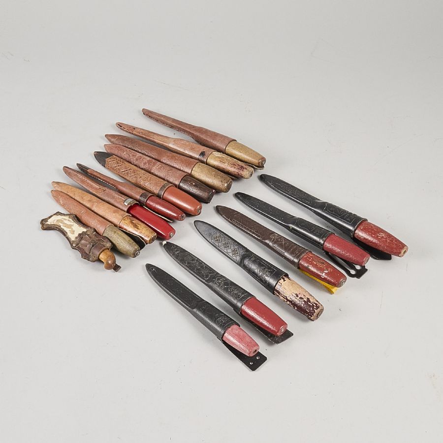 16 st, bland annat Morakvnivar fordral i skinn och plast. Längd: 13-24 cm