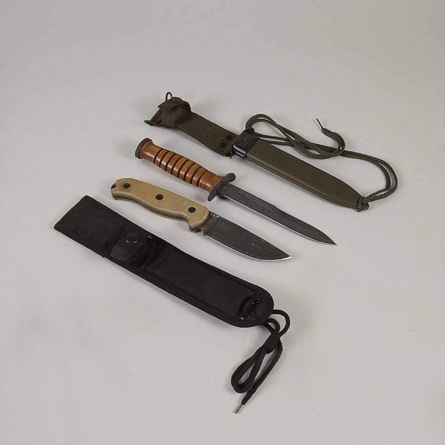 2 st, Böker plus US M-3 samt Ontario Knife Co Tak-1. Längd: 28-33 cm