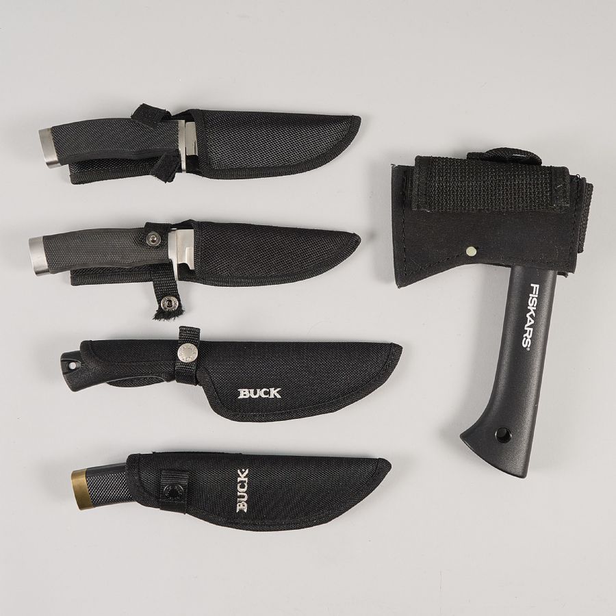 + yxa, 4+ 1, med fordral, including Fiskars Finland, Buck US. Length: 21-24 cm,