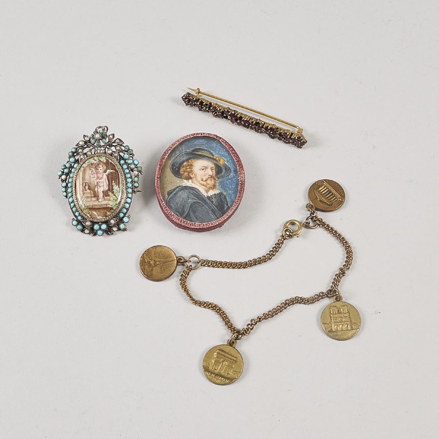 4 delar, Emaljmålning + miniatyr + armband + brosch, modell äldre