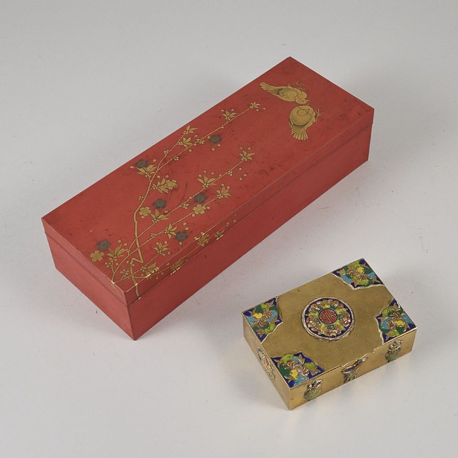 + skrin, Kina, mässing med emaljdekor, bemålat trä. Längd: 12-30 cm. Bredd: 8-11 cm