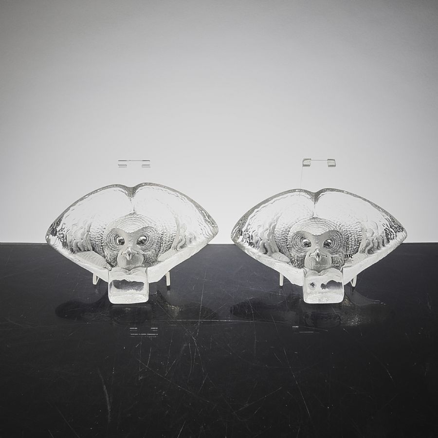 Ett par, Mats Johansson, Ugglor, Målerås, glas. Höjd: 15 cm. Bredd: 20 cm