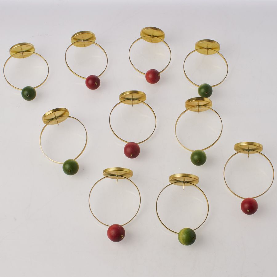 Lampetter, för julgransljus, 10 st, Kaija Aarikka (1929-2014), Finland, cirkelformade ljushållare i mässing, med dekor av träkulan. Höjd: 12 cm