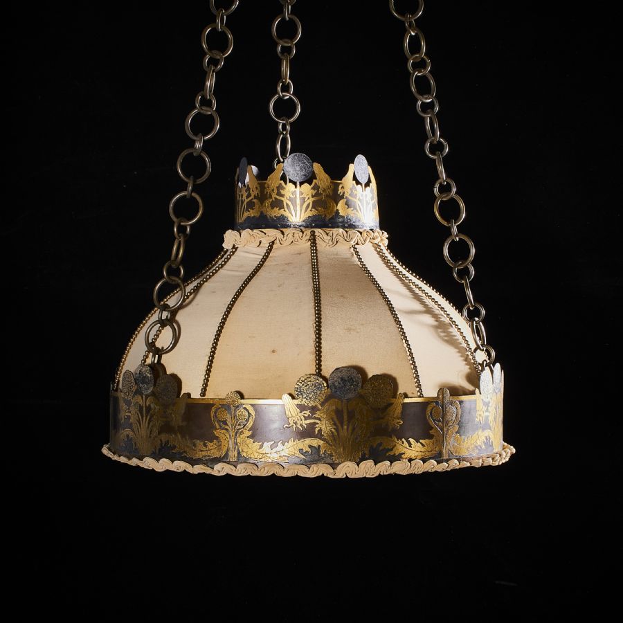 Carl Hjalmar Norrström (1853-1924), Sweden. Art Nouveau, late 19th - early 20th century. Stomme av koppar med dekor av maskrosor och annan växtlighet. Diameter: 45 cm. Hjalmar Norrström bodde på Ängsvägen 21 i Storängen, Tyget med slitage och skador. Saknar elektrifiering/ljuspunkter.