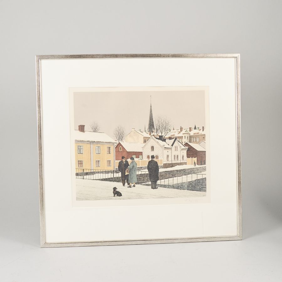 Litografi, Vinterscen från Arboga. Signerad, bildmått: 30x37, yttermått inklusive ram: 54x57 cm