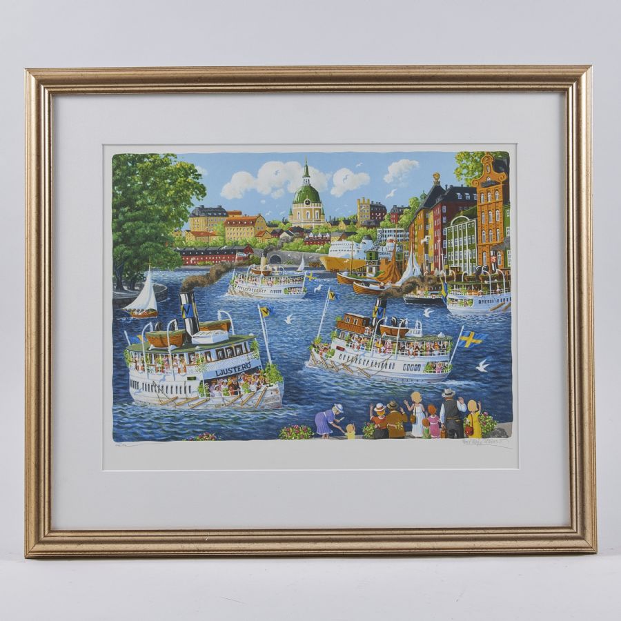 Signerad, numrerad EA, Waxholmsbåtar, Stockholm. Färglitografi, bildmått: 34x44 cm, yttermått inklusive ram: 55x63 cm