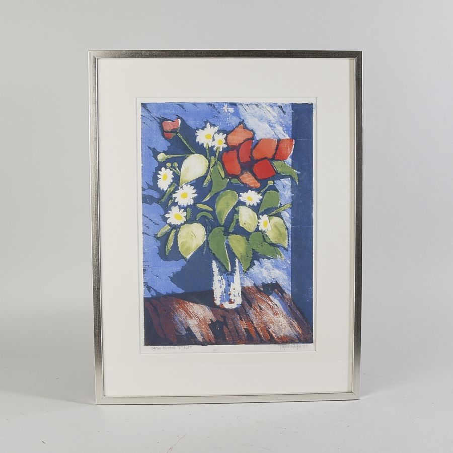 Ingar Nibfelst. Sodn . Signerad, numrerad 54/160, - 87, "blommor mot blått". Färglitografi, bildmått: 44x30 cm, yttermått inklusive ram: 62x48 cm.