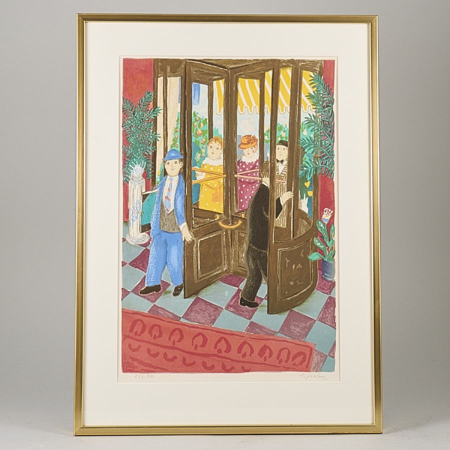 Signerad, numrerad 237/280, i svängdörren. Färglitografi, bildmått: 56x37 cm, yttermått inklusive ram: 74x54 cm