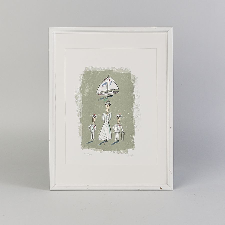 Signerad, numrerad 232/295, figurer & segelbåt. Färglitografi, bildmått: 23x18 cm, yttermått inklusive ram: 42x32 cm