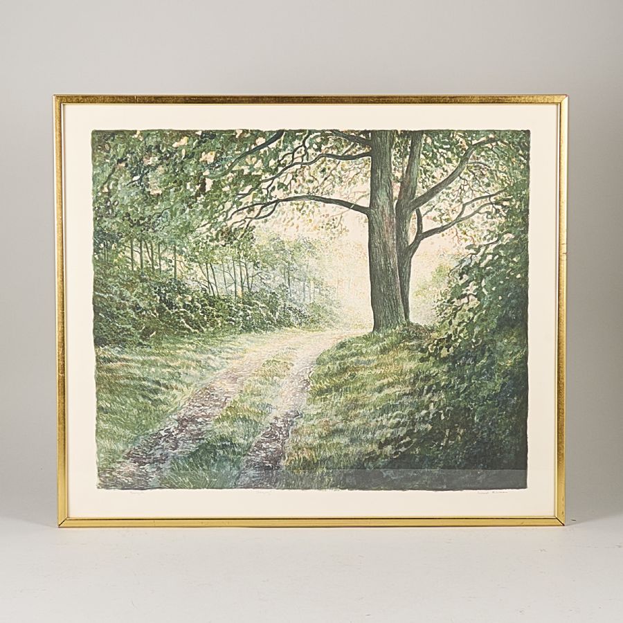 "Skogsväg". Signerad, PT. Färglitografi, bildmått: 54x64 cm, yttermått inklusive ram: 64x75 cm