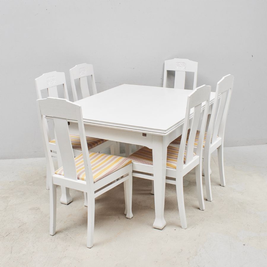 7 delar, Bord + 6 stolar, Jugend, bemålat. Längd: 120+ 2x52 D, 99, höjd: 77 cm