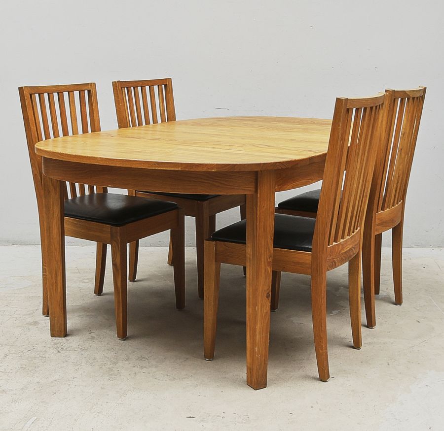 5 delar ek, nutida. Längd: 160 cm, bredd: 105 cm, höjd: 74 cm, + iläggsskiva 49,5 cm