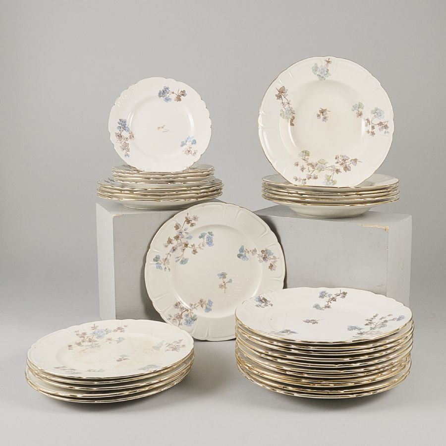 Gustavsberg, Sweden, "Geranium", porcelain, dekor av blommor och guldkant, 6+ 11 mattallrikar, 6 djupa tallrikar, 4 förrättstallrikar, 5 assietter. Diameter: 18-25. 5, colour loss.