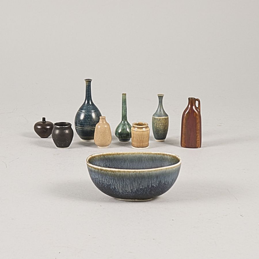 + skål, 8+ 1, bland annat 2 st Carl-Harry Stålhane Rörstrand, 1 st Berndt Friberg Gustavsberg, samt Henning Rosenqvist Höganäs, glaserad stengodslera, Höjd: 3-9 cm