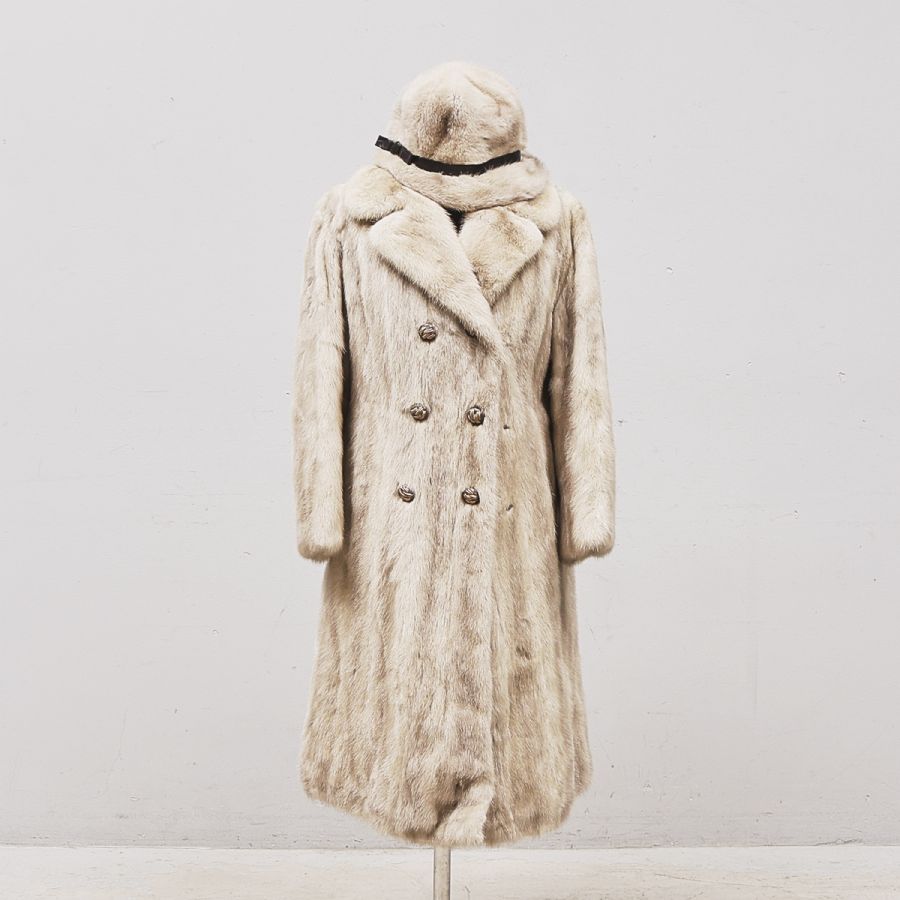 + hatt med skinnbrätte, Saga Mink, dubbelknäppt klädda knappar, storlek: 38 ca. Längd: 100 cm