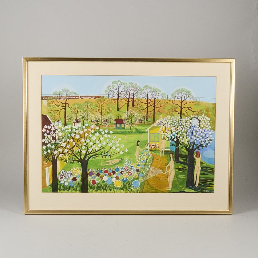 Kurt Vastad. Signed, dated 1977, i trädgården. Mixed media, Image dimensions: 40x60 cm, outer dimensions including frame: 55x73,